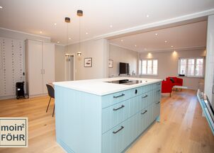 • Kombinierter Wohn-/Essbereich mit Eichenparkett, moderne Einbauküche und Zugang zum Südbalkon